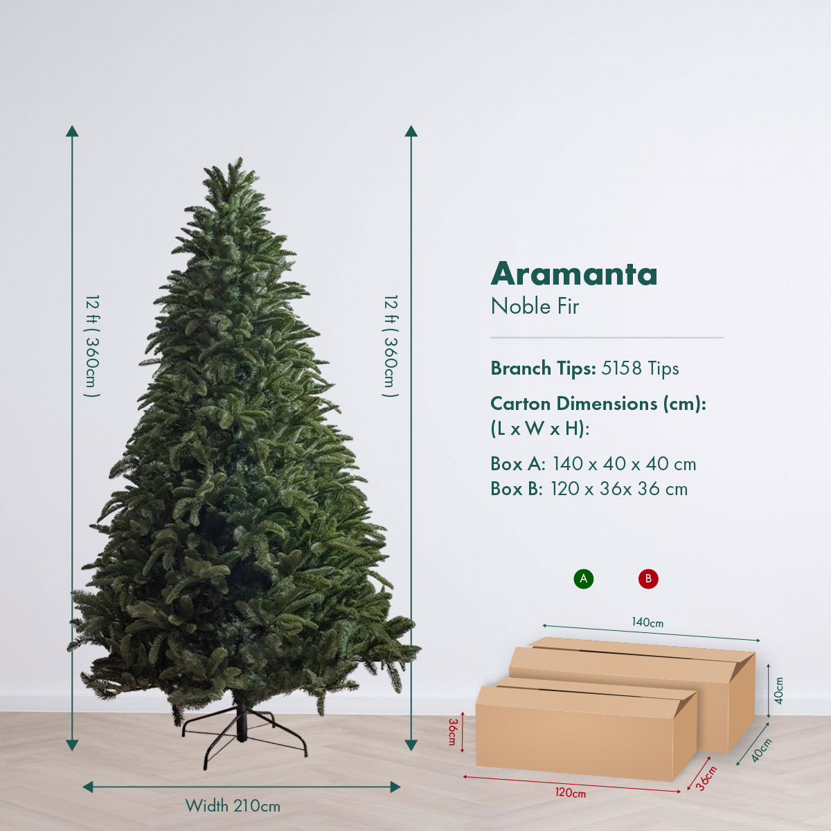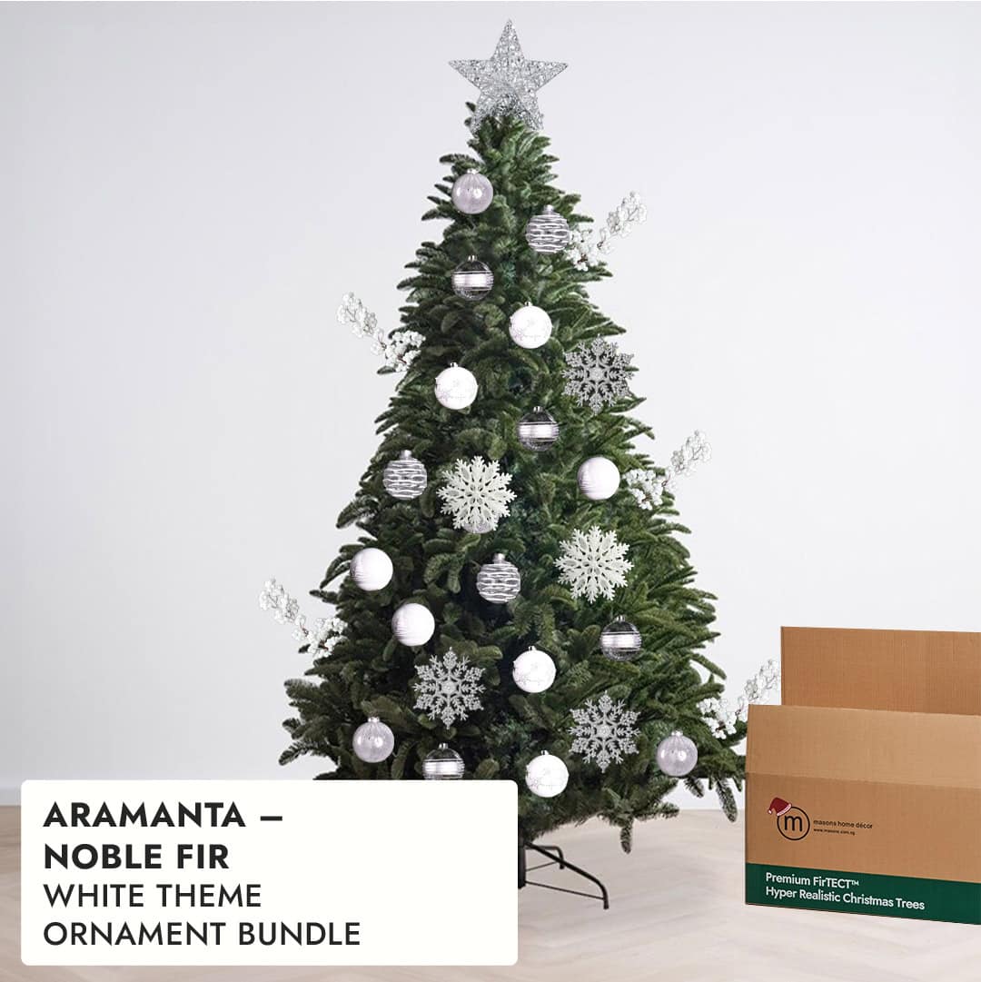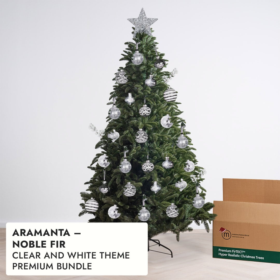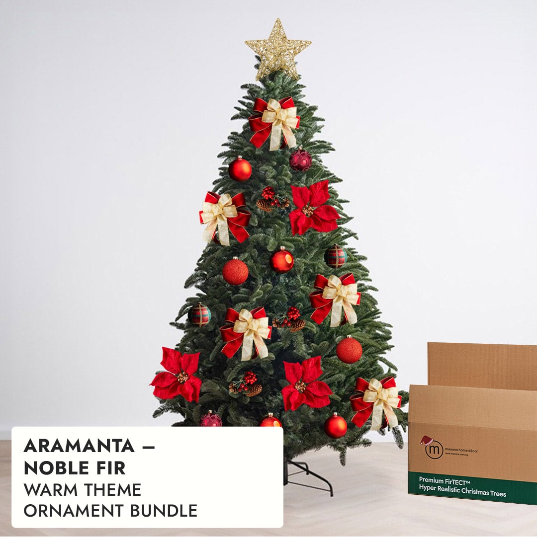 For best effect, avoid using overly artificial green décor like plastic leaf picks or imitation fir branches. Their tone and texture often clash with the Aramanta’s premium lifelike finish, which already mimics a real tree to near perfection.