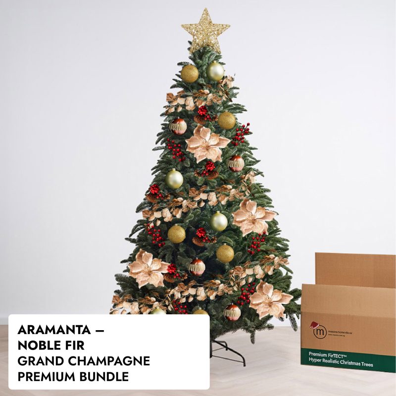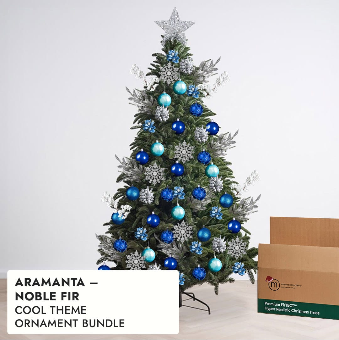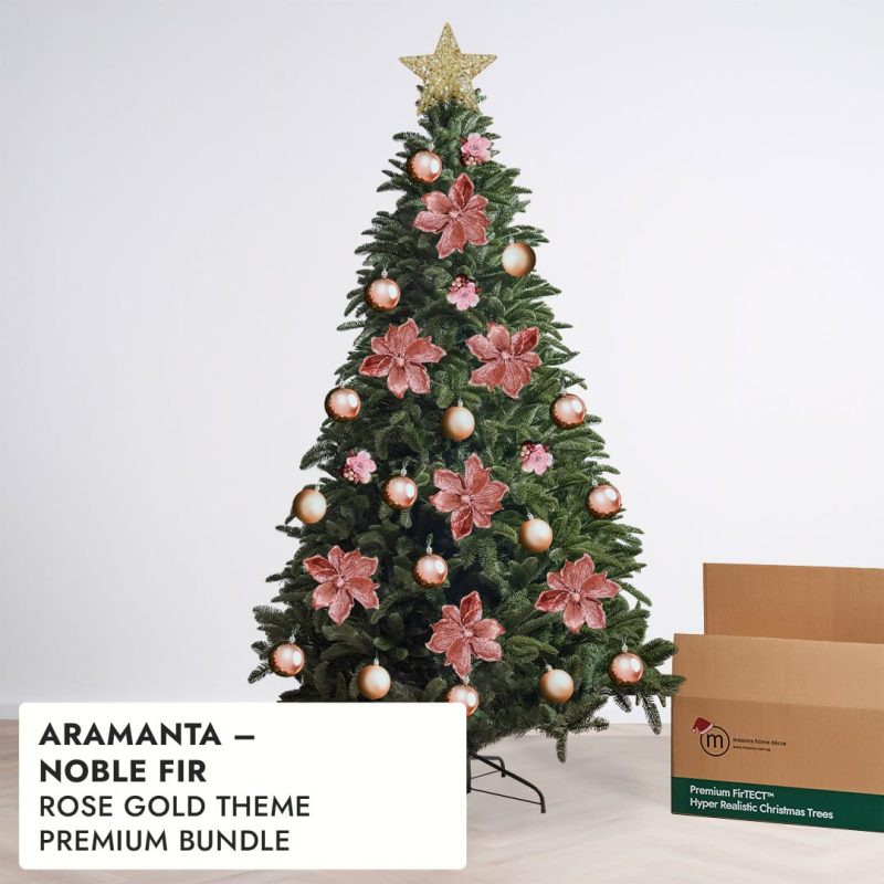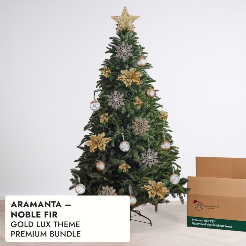 The Aramanta Noble Fir shines in any setting — from minimalist elegance to lavish, ornament-laden glory. Its gently sloping, realistic branches look majestic with just lights, or layered with heirloom baubles and statement pieces.