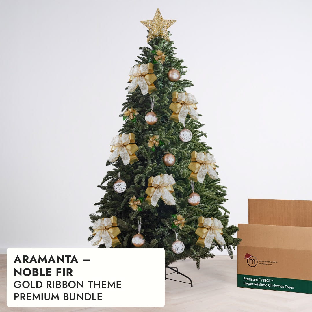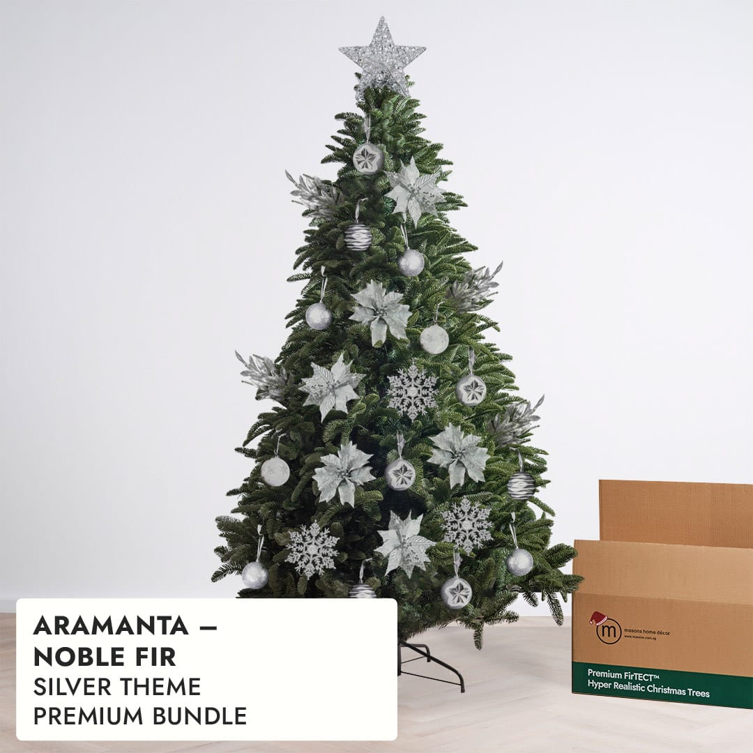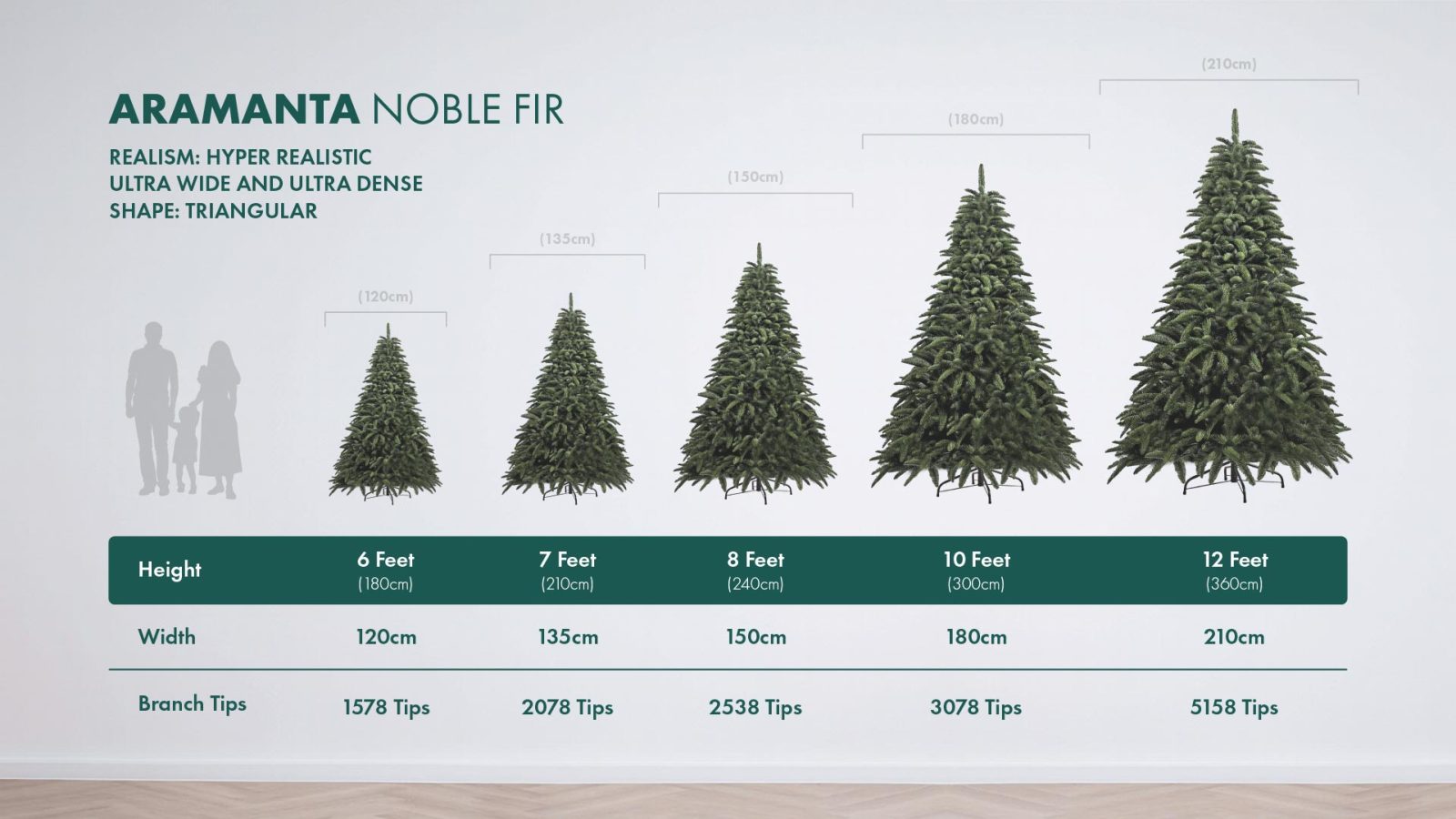 The Aramanta Noble Fir shines in any setting — from minimalist elegance to lavish, ornament-laden glory. Its gently sloping, realistic branches look majestic with just lights, or layered with heirloom baubles and statement pieces.