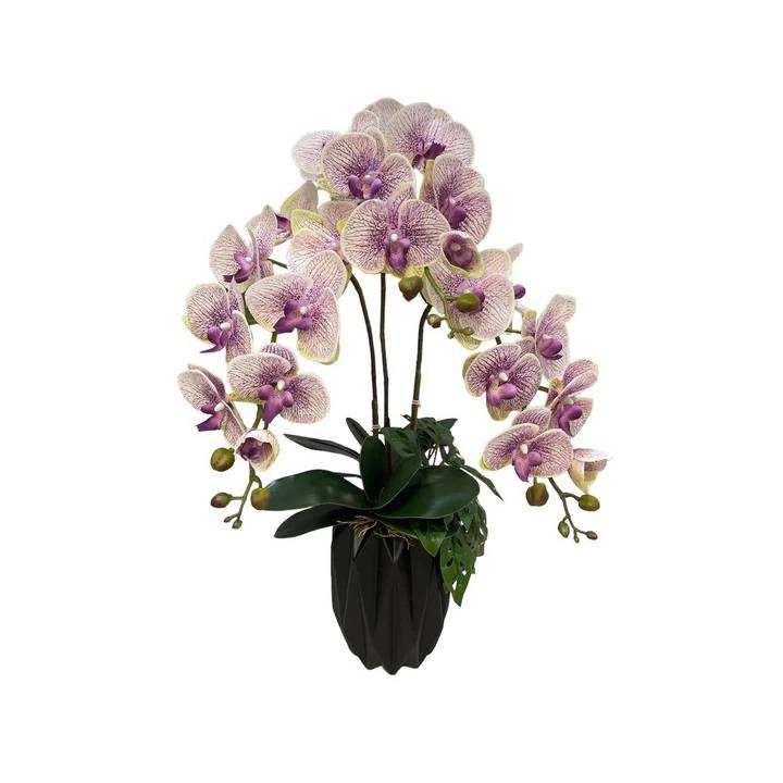 Artificial 3-Stalk Phalaenopsis Orchid Arrangement with Mini Monstera – Spotted Purple – Black Pot