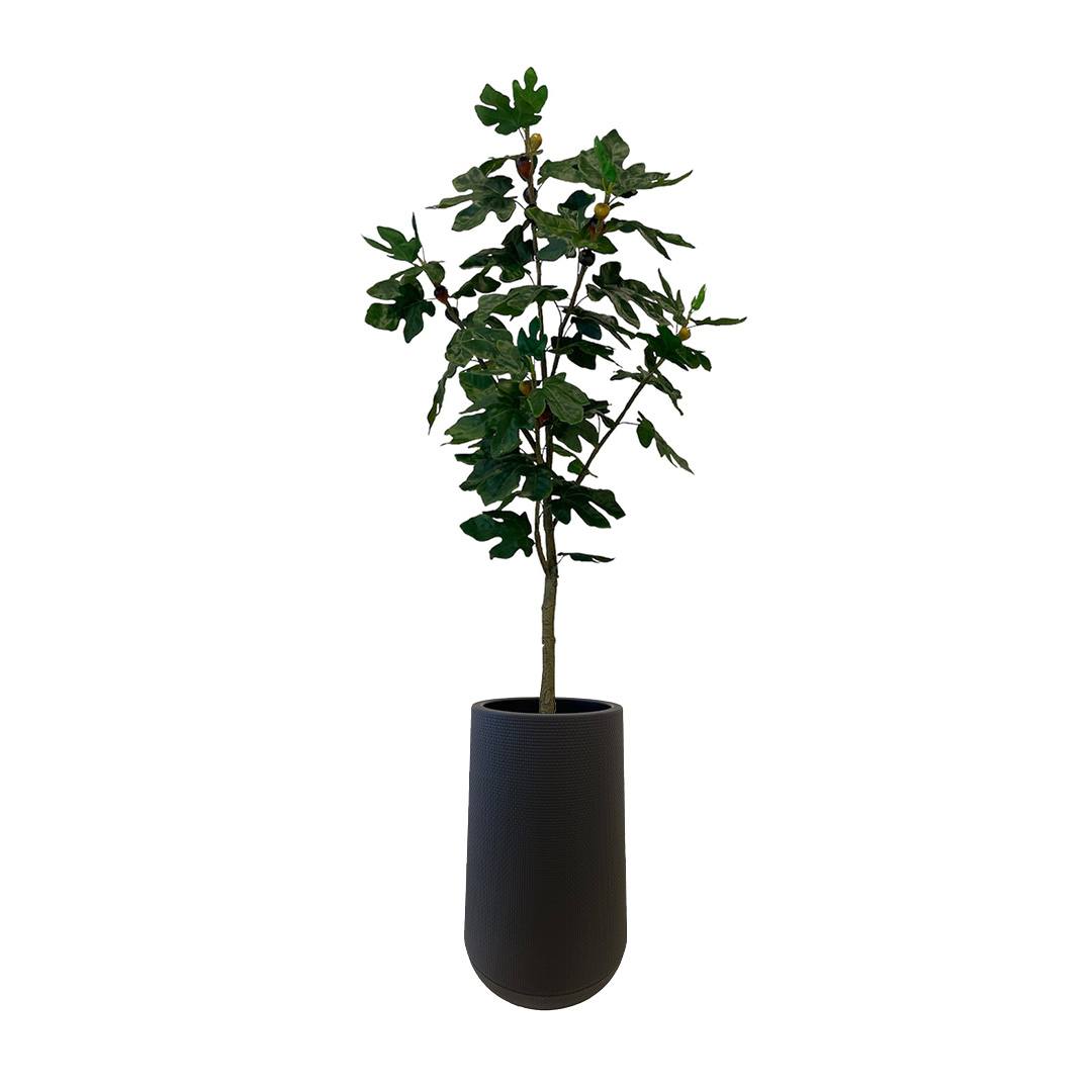 Artificial Fig Tree – Tall Black Textured Plastic Pot (with inner elevation), paired with Black Pebbles