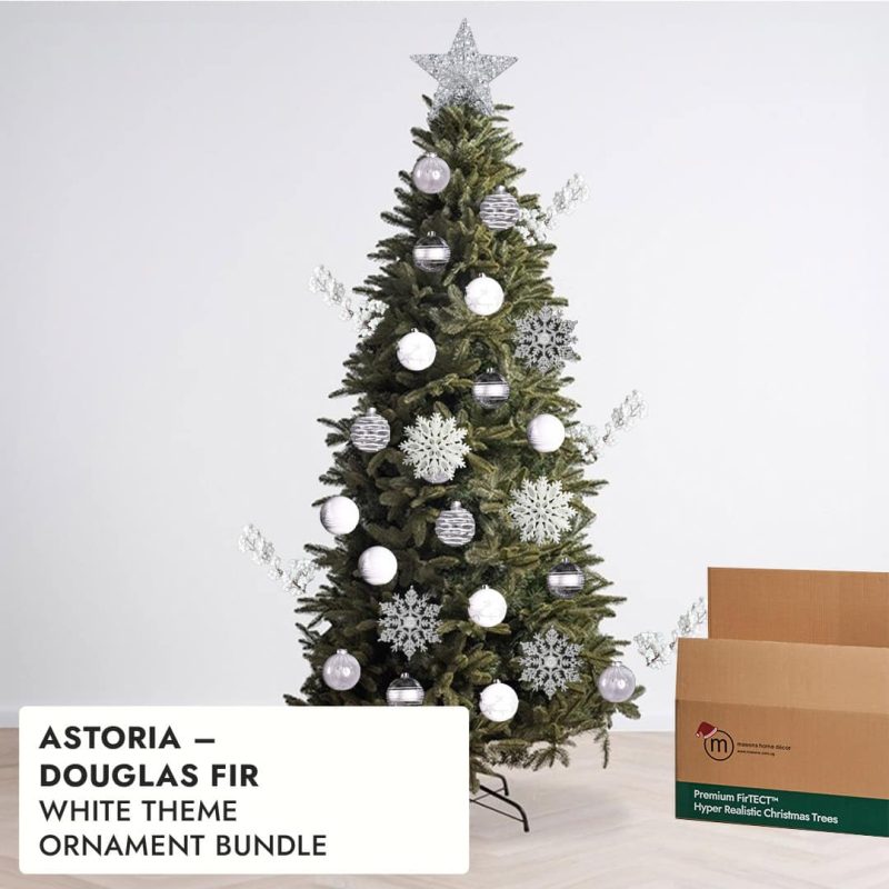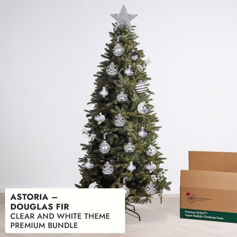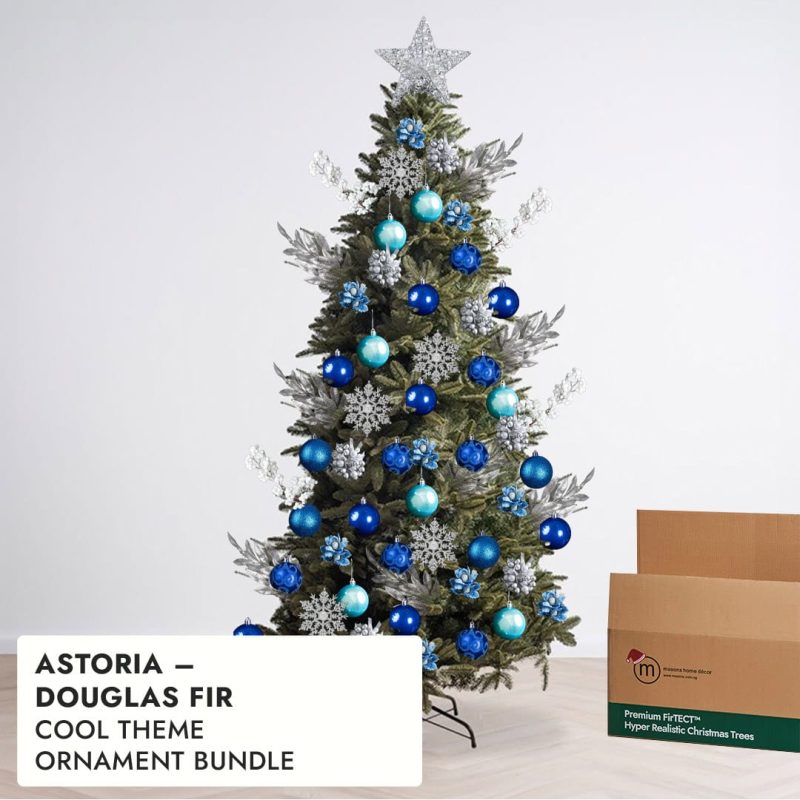 Astoria’s slender build makes it perfect for vertical decorating styles. Use longer ornaments, cascading ribbons, or icicle lights to highlight its upright elegance. Avoid garlands made from artificial fir — their heavy green tone can clash with Astoria’s hyper-realistic branches.