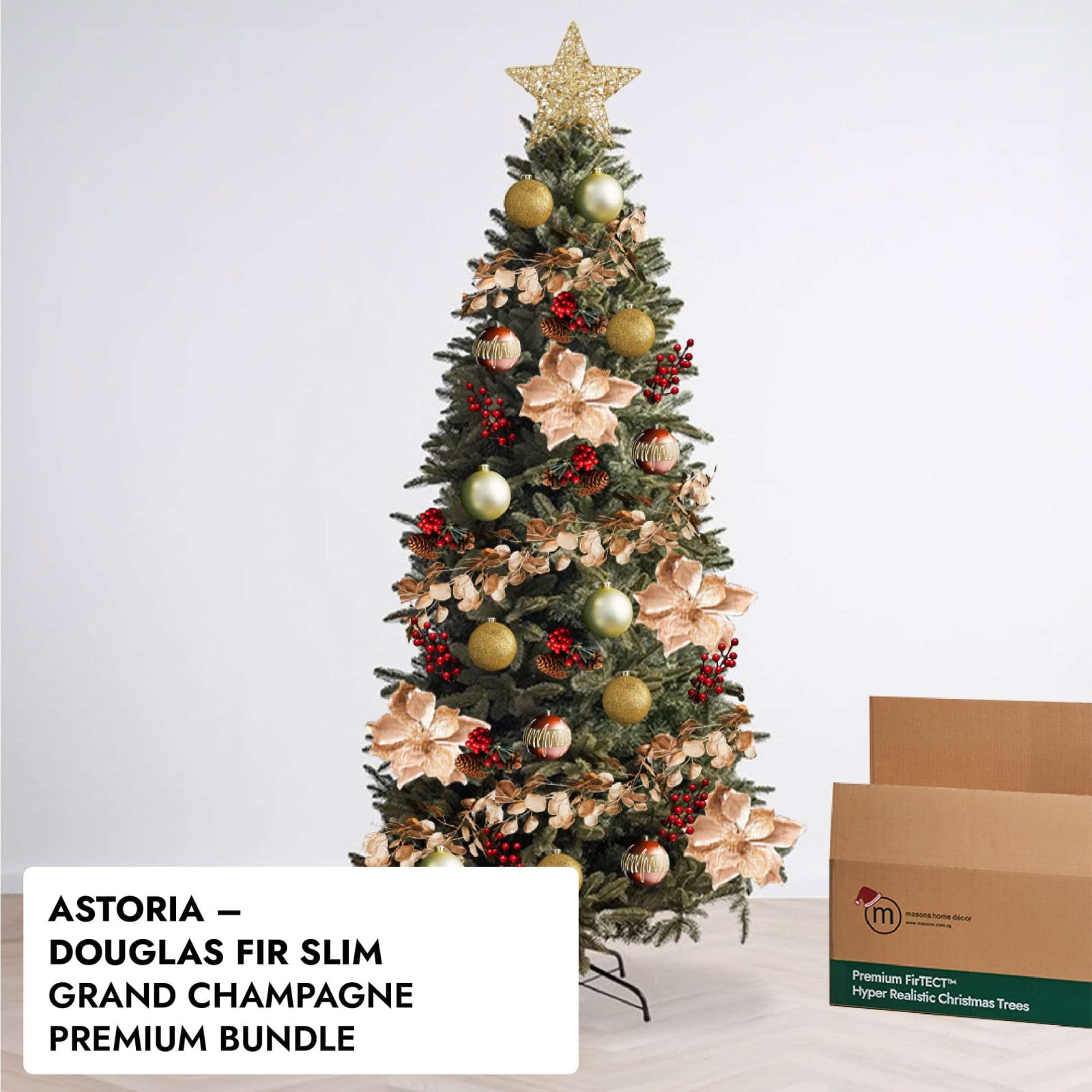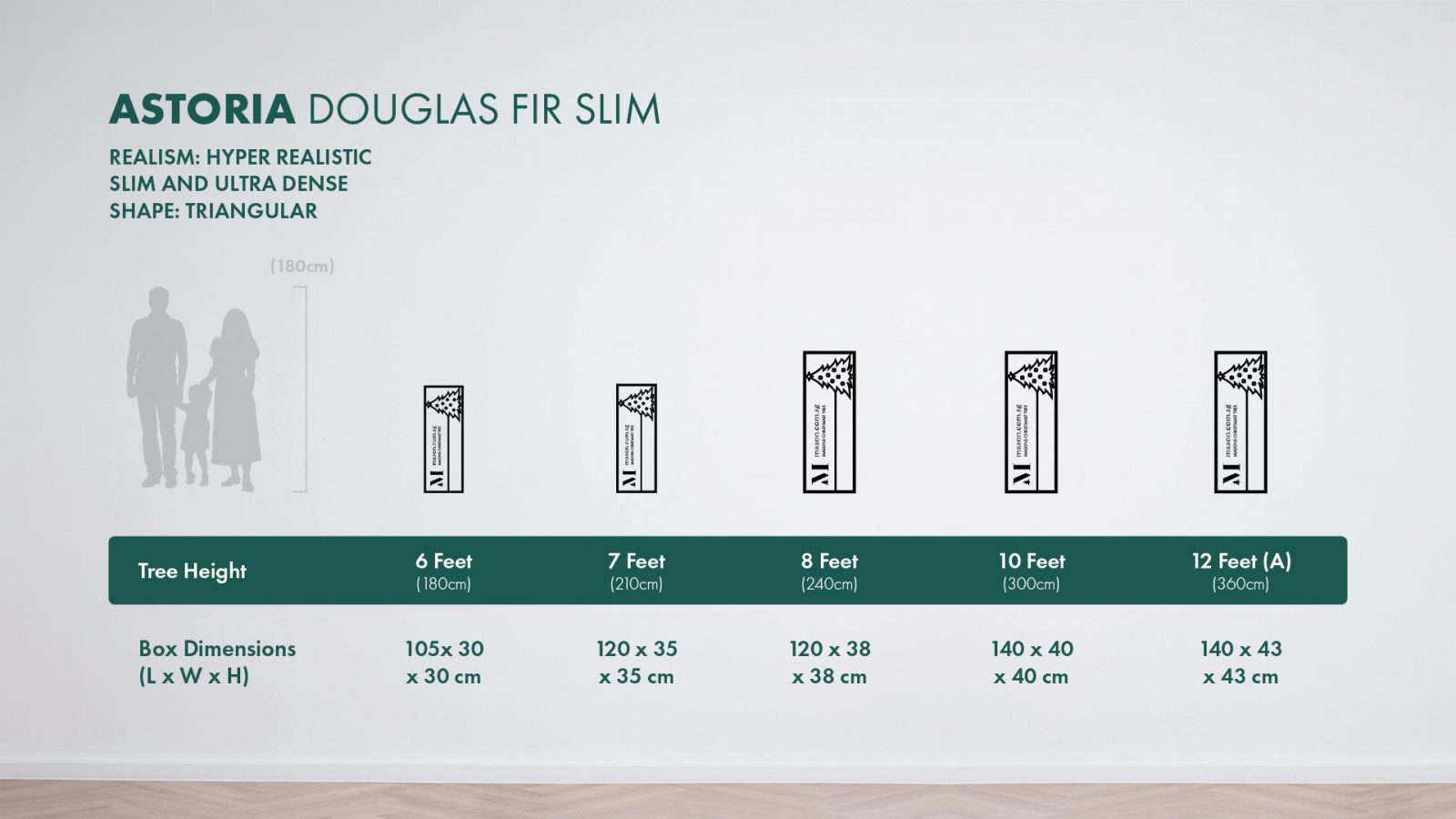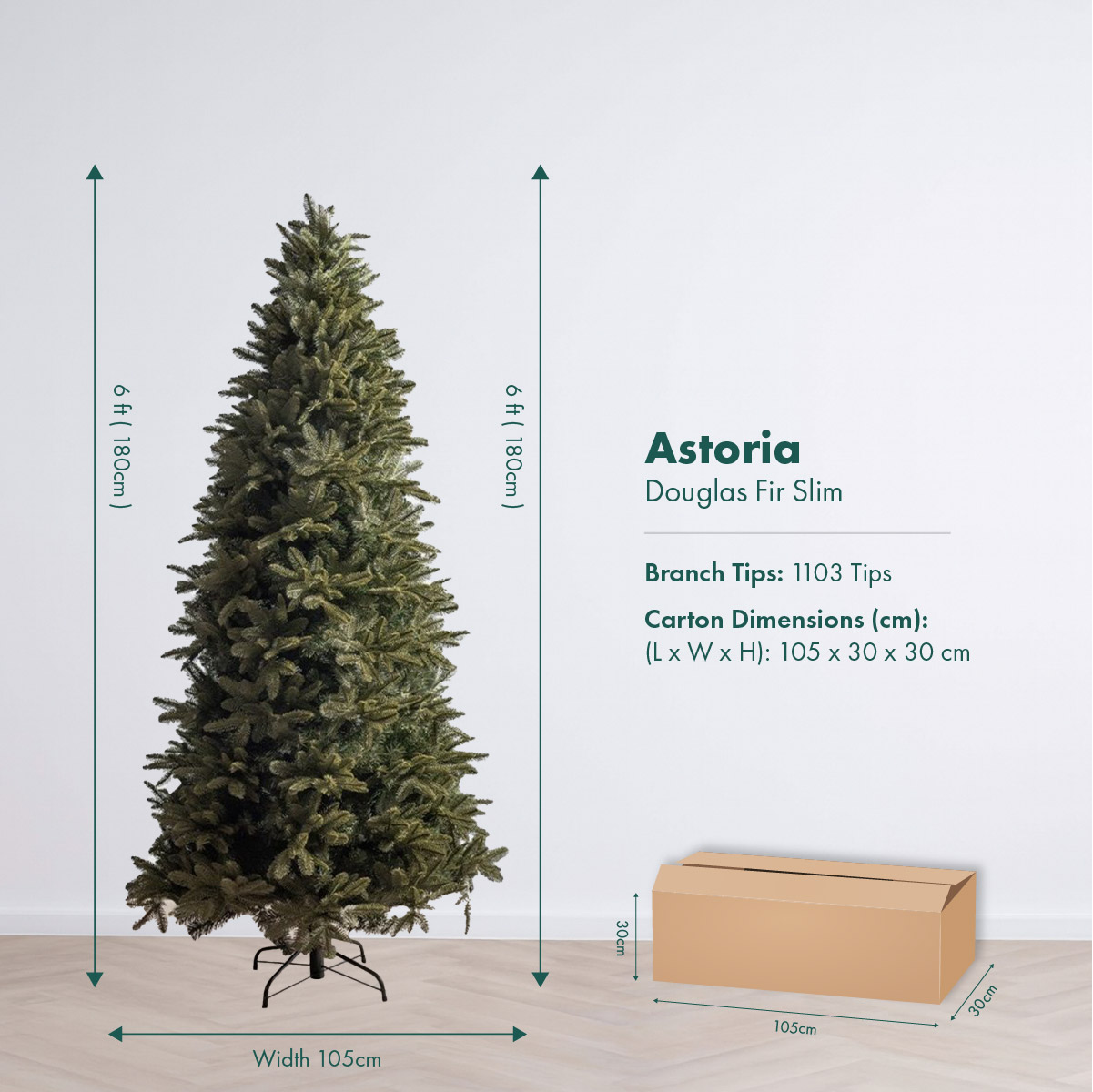 The Astoria was made for the modern home where every square metre matters. Inspired by the natural elegance of a Douglas Fir, this slim Christmas tree is the perfect space-saving solution that doesn’t compromise on realism or fullness. With its ultra-dense foliage and narrow silhouette, Astoria stands tall and proud in hallways, tight corners, or beside furniture — looking just as magical as any full-bodied tree.