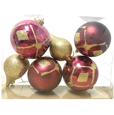The Balsam Baubles set combines rich tones and elegant textures to create a warm, luxurious holiday look. Each set includes 2 genie-shaped baubles (15 cm) and 2 classic round baubles (8 cm), all finished in a beautiful mix of glittery and shiny/matte surfaces. In deep burgundy and gold, these ornaments are perfect for traditional, opulent, or romantic Christmas tree themes. Tip: hang the finial shapes lower on the tree as statement pieces, and scatter the smaller ones higher for a balanced, designer finish.