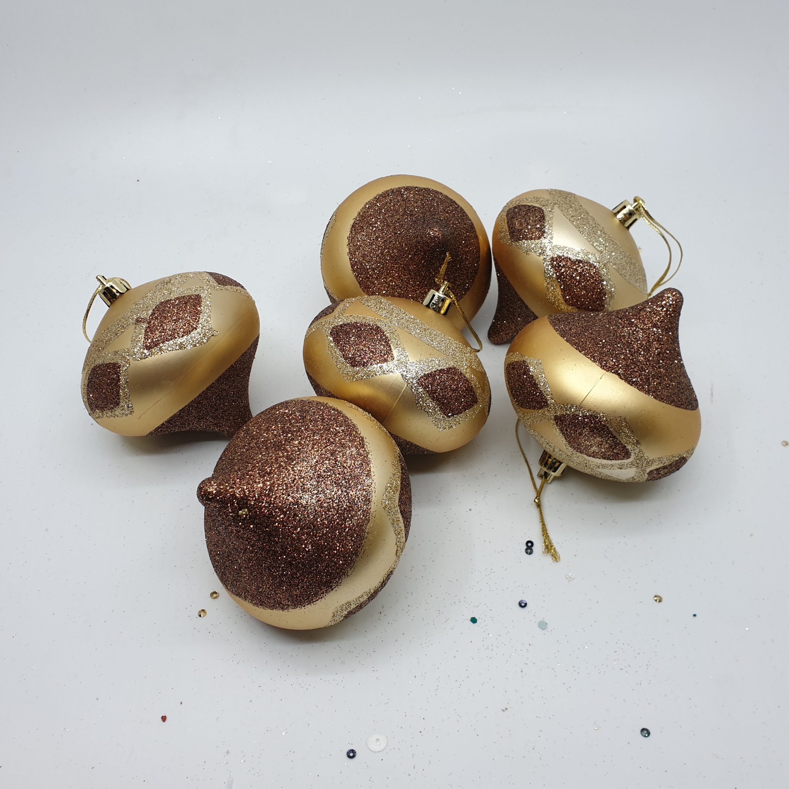 The Chestnut Bauble offers a rich, earthy elegance perfect for warm and luxurious holiday palettes. Measuring approximately 7 cm wide and 8 cm tall, each ornament features a glittery surface with a brown and gold finish that shimmers beautifully under festive lighting. Sold in a set of 6, these baubles are ideal for rustic, vintage, or nature-inspired Christmas themes. Tip: pair with pine accents, champagne tones, or woodland ornaments for a cosy, cohesive look.