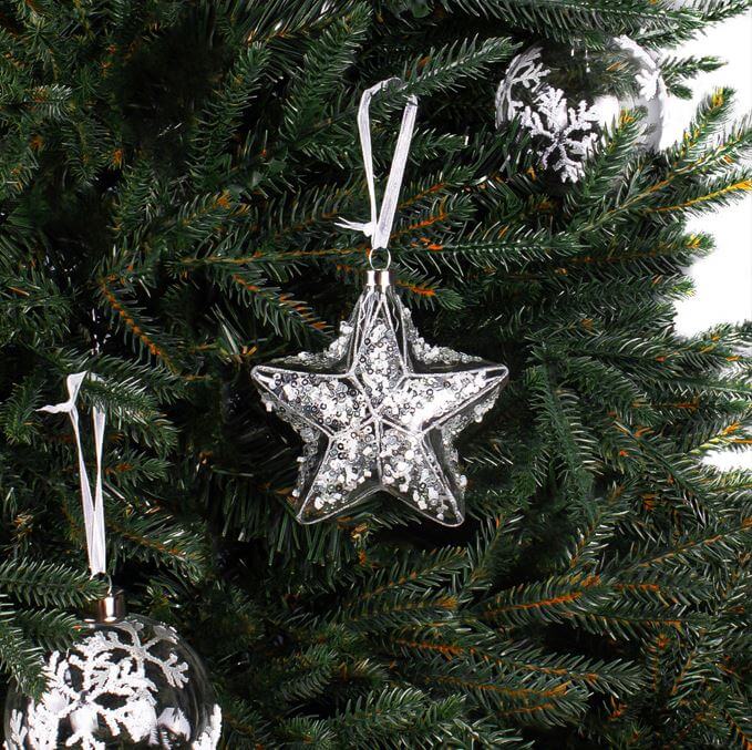 The Magi Glass Baubles set combines classic elegance with celestial charm. This box of 6 includes 3 round 8 cm baubles adorned with delicate white glitter snowflake motifs, and 3 star-shaped 10 cm baubles finished with shimmering silver glitter accents. Crafted in clear glass, these ornaments add depth, sparkle, and balance to your Christmas tree. Ideal for frosty, white, or ethereal-themed décor. Style tip: alternate shapes throughout the tree for a beautifully layered look.
