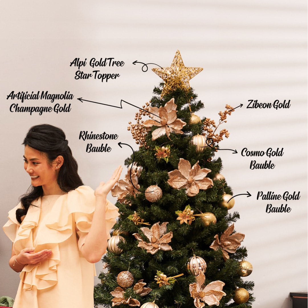 The Artificial Magnolia Champagne Gold looks great on any tree. Match it with the Alpi Gold Tree Star Topper, Rhinestone Bauble, Zibeon Gold, Cosmo Bronze Bauble and Palline Gold Bauble to get this look. Happy decorating!