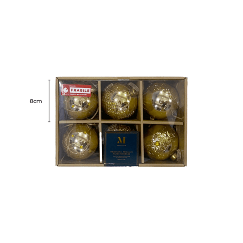 The Mirthful Glass Baubles exude festive joy with their brilliant shine and intricate detailing. Each 8 cm ornament boasts a glossy gold surface, adorned with sparkling glitter and jewel accents in elegant, varied patterns. Packaged as a set of 6, these baubles are perfect for adding a glamorous, celebratory touch to classic or contemporary Christmas themes. Tip: mix with silver pieces for a dynamic, high-contrast display, or cluster for maximum sparkle.