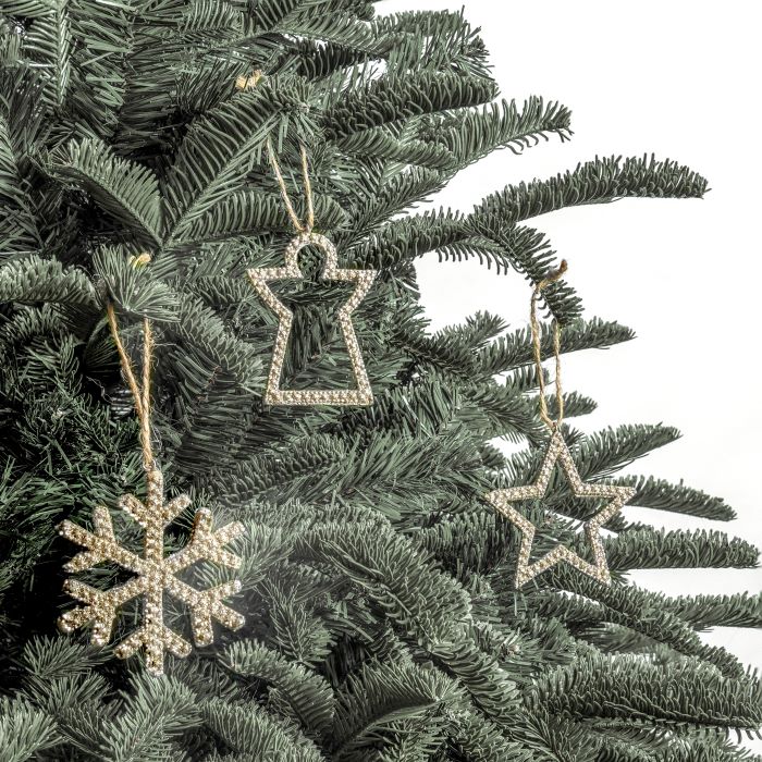 The Ryan Baubles add a delicate shimmer and symbolic elegance to your festive display. This set of 6 features glittery ornaments in the form of a star, snowflake, and angel, each crafted with a light, airy silhouette that brings a sense of space and sparkle to your tree. Ranging in size from 6 x 7.5 cm to 8 x 8 cm, these pieces are perfect for minimalist, spiritual, or nature-inspired themes. Tip: hang near soft lighting to let their graceful forms glow gently.